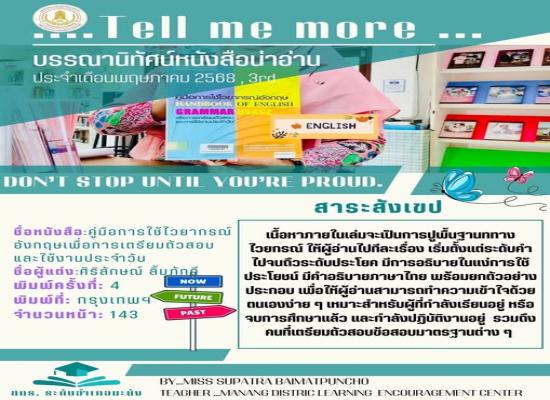 ศูนย์ส่งเสริมการเรียนรู้ระดับอำเภอมะนัง ดำเนินการจัดกิจกรรม ส่งเสริมการวิเคราะห์ และการอ่านอย่างเป็นกระบวนการโดยผู้บริหารและครูเป็นต้นแบบ ภายใต้กิจกรรมกิจกรรม \'\'Tell me more\" คู่มือการใช้ไวยกรณ์อังกฤษเพื่อการเตรียมตัวสอบและการใช้งานประจำวันวัน