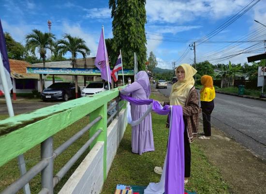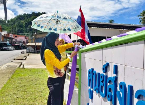 ศกร.ระดับตำบลควนสตอ จัดตกแต่งสถานที่ประดับพระบรมฉายาลักษณ์สมเด็จพระนางเจ้าฯ พระบรมราชินี ประดับธงชาติไทยร่วมกับธงอักษรพระนามาภิไธย ส.ท. และประดับผ้าระบายสีม่วงร่วมกับผ้าระบายสีขาวตามอาคารสำนักงาน สกร.ระดับอำเภอควนโดน