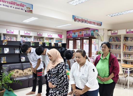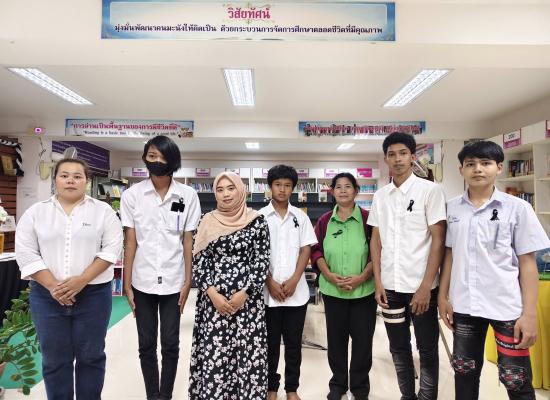 ห้องสมุดประชาชนอำเภอมะนัง นำนักศึกษาเข้าร่วมกิจกรรม ร้อยดวงใจ ทำริบบิ้นดำ ถวายอาลัย