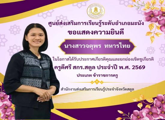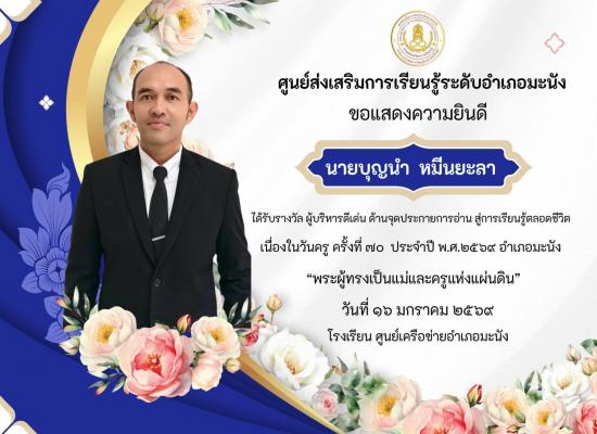 วันที่ 20 มกราคม 2569 นายบุญนำ หมีนยะลา ผู้อำนวยการสถานศึกษา ศูนย์ส่งเสริมการเรียนรู้ระดับอำเภอมะนัง มอบหมายให้นายนภัทร จันทวิลาศ ครูศูนย์การเรียนรู้ ร่วมบริจาคโลหิต เพื่อจัดเตรียมโลหิตสำรองในการให้ความช่วยเหลือผู้ป่วยในพื้นที่จังหวัดสตูลให้เพีย |